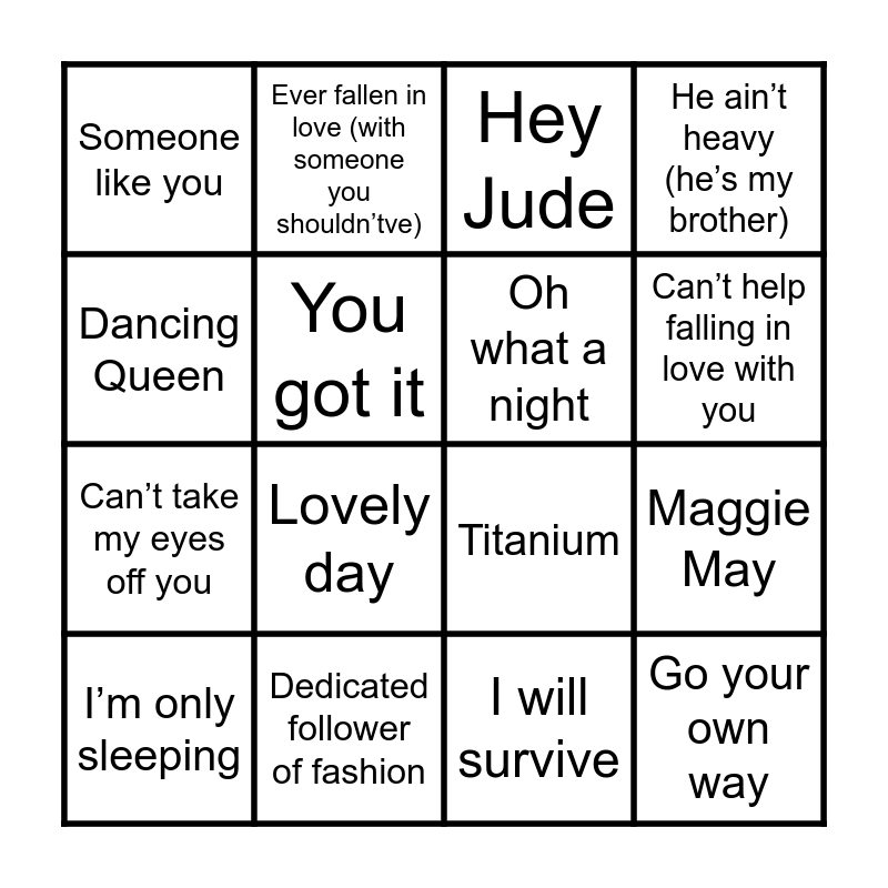 This bingo card has 40 words: Love really hurts without you, Titanium, Shake it off, Oh what a night, Englishman in New York, I want you back, Can’t help falling in love with you, Still haven’t found what I’m looking for, Dancing Queen, Go your own way, Maggie May, He ain’t heavy (he’s my brother), I’m only sleeping, I will survive, Dedicated follower of fashion, Never gonna give you up, Marry you, Someone like you, American pie, Hey Jude, Black horse and the cherry tree, Back for good, Can’t take my eyes off you, You got it, Rolling in the deep, Crash, Don’t go, Enjoy the silence, Going for gold, Heroes, Let it be, Fix you, I wanna dance with somebody, Let her go, Lovely day, Stop, 500 miles, Don’t leave me this way, Ever fallen in love (with someone you shouldn’tve) and Losing my religion.