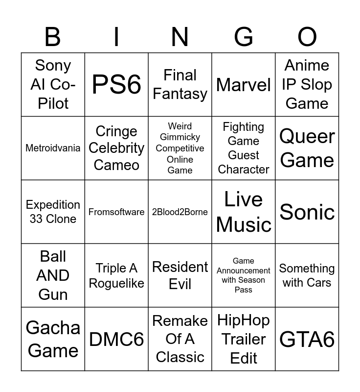 This bingo card has a free space and 24 words: Triple A Roguelike, DMC6, Weird Gimmicky Competitive Online Game, Gacha Game, Anime IP Slop Game, Sony AI Co-Pilot, Metroidvania, PS6, Live Music, Resident Evil, Fighting Game Guest Character, Expedition 33 Clone, Game Announcement with Season Pass, Something with Cars, Cringe Celebrity Cameo, HipHop Trailer Edit, Sonic, Final Fantasy, Queer Game, Fromsoftware, GTA6, Ball AND Gun, Marvel and Remake Of A Classic.