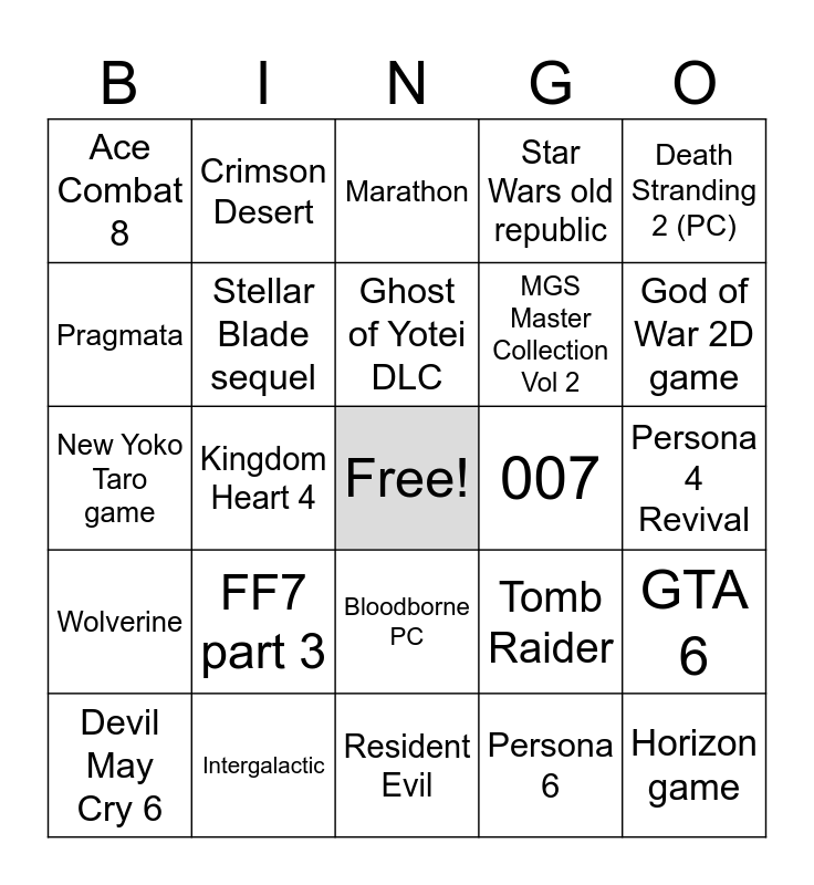 This bingo card has a free space and 24 words: FF7 part 3, Intergalactic, Ghost of Yotei DLC, Devil May Cry 6, Death Stranding 2 (PC), Ace Combat 8, Pragmata, Crimson Desert, 007, Bloodborne PC, MGS Master Collection Vol 2, New Yoko Taro game, Tomb Raider, GTA 6, Stellar Blade sequel, Persona 6, Persona 4 Revival, Marathon, God of War 2D game, Kingdom Heart 4, Horizon game, Wolverine, Star Wars old republic and Resident Evil.