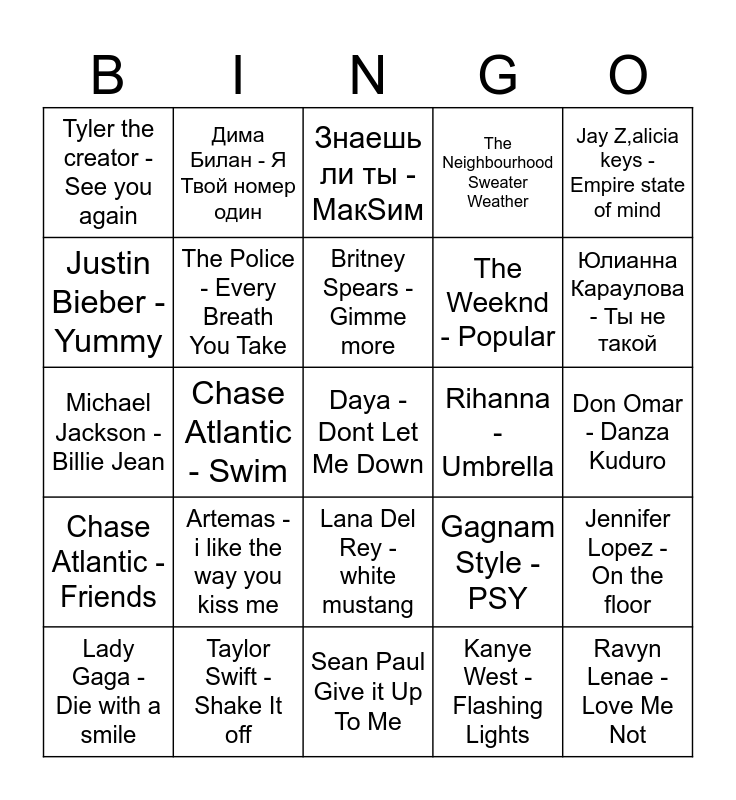 This bingo card has a free space and 24 words: Artemas - i like the way you kiss me, Taylor Swift - Shake It off, Britney Spears - Gimme more, Lady Gaga - Die with a smile, Jay Z,alicia keys - Empire state of mind, Tyler the creator - See you again, Justin Bieber - Yummy, Дима Билан - Я Твой номер один, Rihanna - Umbrella, Lana Del Rey - white mustang, The Weeknd - Popular, Michael Jackson - Billie Jean, Gagnam Style - PSY, Jennifer Lopez - On the floor, The Police - Every Breath You Take, Kanye West - Flashing Lights, Don Omar - Danza Kuduro, Знаешь ли ты - МакSим, Юлианна Караулова - Ты не такой, Chase Atlantic - Swim, Ravyn Lenae - Love Me Not, Chase Atlantic - Friends, The Neighbourhood Sweater Weather and Sean Paul Give it Up To Me.
