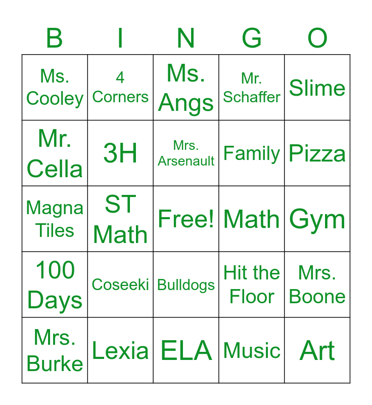 This bingo card has a free space and 30 words: Lexia, JiJi, ST Math, Ms. Sullivan, Ms. Cooley, Ms. Angs, 3H, Bulldogs, Math, ELA, Gym, Art, Music, Health, Pizza, Sunflower, Hit the Floor, 100 Days, Coseeki, Slime, Magna Tiles, Drawing, 4 Corners, Family, Mr. Cella, Mr. Schaffer, Mrs. Boone, Mrs. Burke, Mrs. Arsenault and Ms. Bonin.
