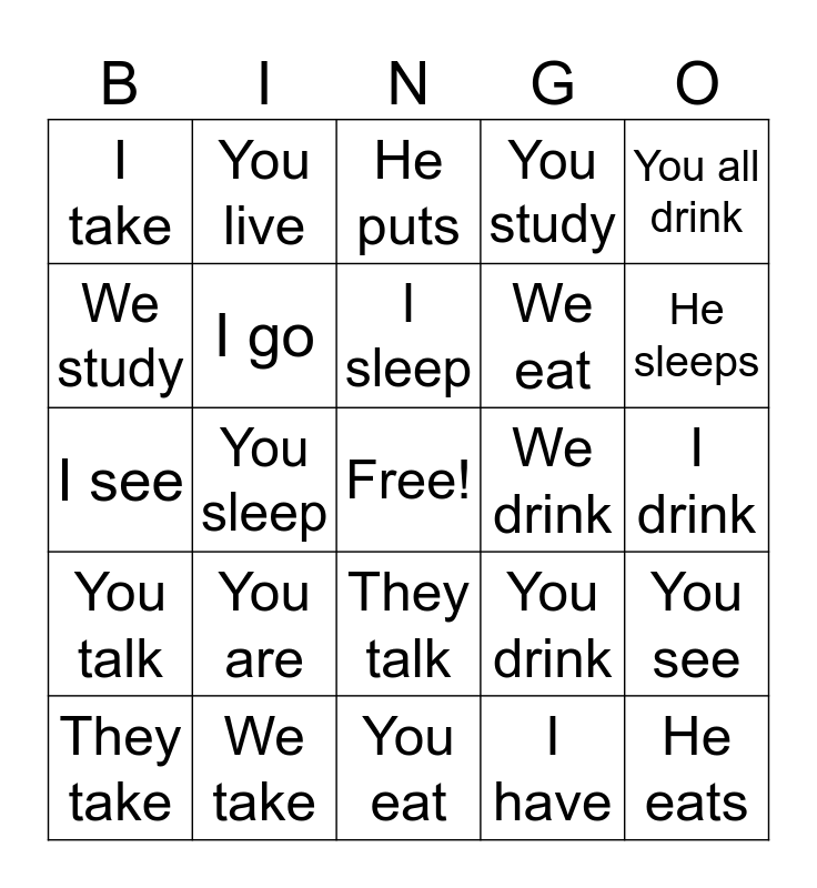 This bingo card has a free space and 54 words: I talk, You talk, He talks, We talk, They talk, I study, You study, He studies, We study, They study, I take, You take, We take, They take, I eat, You eat, He eats, We eat, You all eat, I drink, You drink, She drinks, We drink, You all drink, I live, You live, He shares, I share, We share, I have, She has, We have, We live, I put, He puts, They put, I see, You see, She sees, I go, You go, They go, We go, I am, You are, He is, They are, We are, I sleep, You sleep, He sleeps, We sleep, They sleep and You Sleep (formal ).