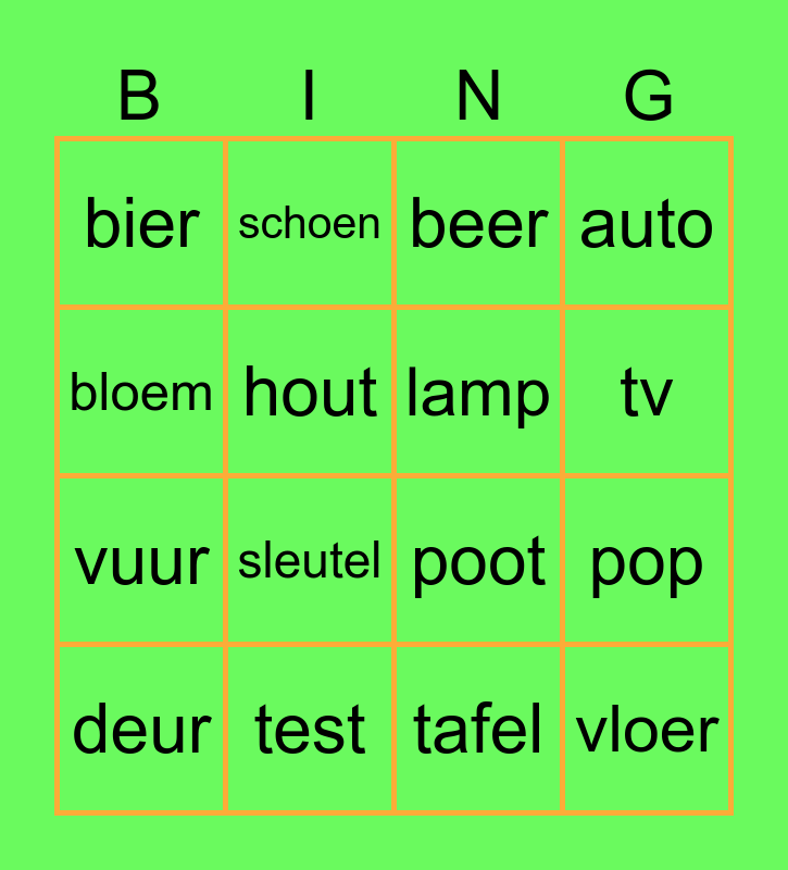This bingo card has 16 words: test, pop, beer, bier, vuur, schoen, poot, tafel, bloem, hout, deur, auto, sleutel, tv, lamp and vloer.