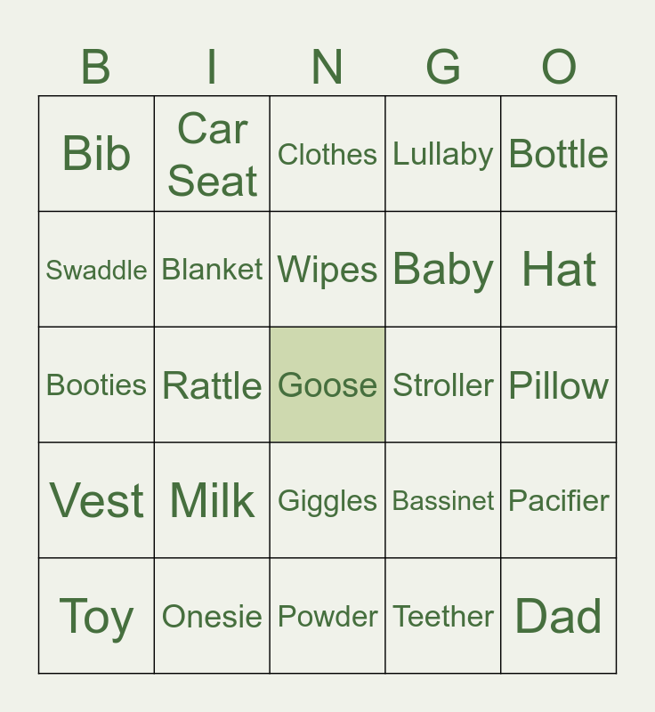 This bingo card has a free space and 29 words: Diaper, Onesie, Clothes, Crib, Bottle, Bib, Blanket, Wipes, Stroller, Pacifier, Toy, Rattle, Teether, Dad, Booties, Comp, Powder, Bassinet, Hat, Vest, Milk, Mom, Baby, Pillow, Swaddle, Car Seat, Giggles, Lullaby and Peek-a-Boo.