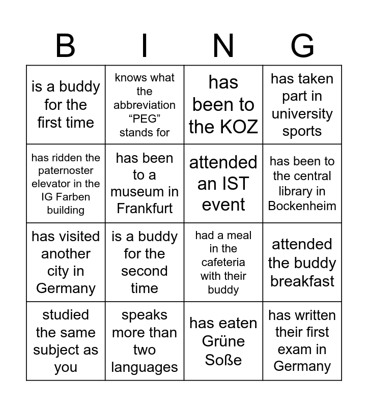 This bingo card has 16 words: speaks more than two languages, attended the buddy breakfast, has been to the KOZ, is a buddy for the first time, has visited another city in Germany, knows what the abbreviation “PEG” stands for, had a meal in the cafeteria with their buddy, has eaten Grüne Soße, has ridden the paternoster elevator in the IG Farben building, has been to a museum in Frankfurt, studied the same subject as you, has taken part in university sports, is a buddy for the second time, has been to the central library in Bockenheim, attended an IST event and has written their first exam in Germany.