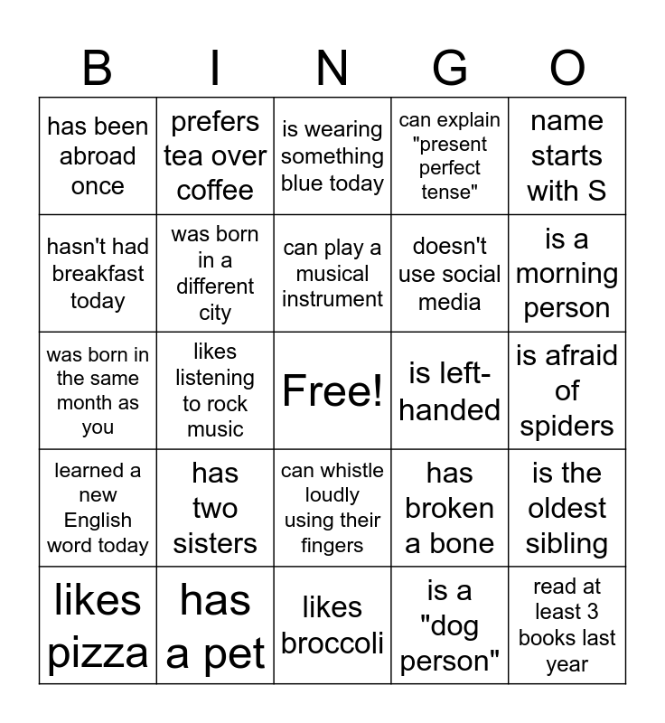 This bingo card has a free space and 24 words: has two sisters, has a pet, can play a musical instrument, likes pizza, name starts with S, has been abroad once, hasn't had breakfast today, prefers tea over coffee, is left-handed, can whistle loudly using their fingers, doesn't use social media, was born in the same month as you, has broken a bone, is the oldest sibling, was born in a different city, is a "dog person", is afraid of spiders, is wearing something blue today, is a morning person, likes listening to rock music, read at least 3 books last year, learned a new English word today, can explain "present perfect tense" and likes broccoli.