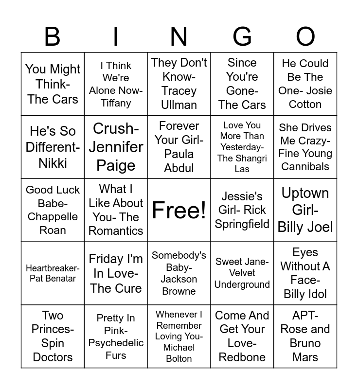 This bingo card has a free space and 24 words: Friday I'm In Love- The Cure, Pretty In Pink- Psychedelic Furs, Forever Your Girl- Paula Abdul, Two Princes- Spin Doctors, He Could Be The One- Josie Cotton, You Might Think- The Cars, He's So Different- Nikki, I Think We're Alone Now- Tiffany, Jessie's Girl- Rick Springfield, Somebody's Baby- Jackson Browne, Love You More Than Yesterday- The Shangri Las, Good Luck Babe- Chappelle Roan, Sweet Jane- Velvet Underground, Eyes Without A Face- Billy Idol, Crush- Jennifer Paige, Come And Get Your Love- Redbone, Uptown Girl- Billy Joel, They Don't Know- Tracey Ullman, She Drives Me Crazy- Fine Young Cannibals, What I Like About You- The Romantics, APT- Rose and Bruno Mars, Heartbreaker- Pat Benatar, Since You're Gone- The Cars and Whenever I Remember Loving You- Michael Bolton.