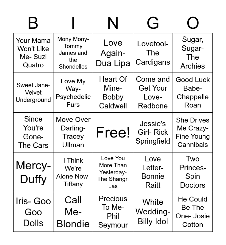 This bingo card has a free space and 24 words: I Think We're Alone Now- Tiffany, Call Me- Blondie, Heart Of Mine- Bobby Caldwell, Iris- Goo Goo Dolls, Sugar, Sugar- The Archies, Your Mama Won't Like Me- Suzi Quatro, Sweet Jane- Velvet Underground, Mony Mony- Tommy James and the Shondelles, Jessie's Girl- Rick Springfield, Love You More Than Yesterday- The Shangri Las, Come and Get Your Love- Redbone, Since You're Gone- The Cars, Love Letter- Bonnie Raitt, Two Princes- Spin Doctors, Love My Way- Psychedelic Furs, White Wedding- Billy Idol, She Drives Me Crazy- Fine Young Cannibals, Love Again- Dua Lipa, Good Luck Babe- Chappelle Roan, Move Over Darling- Tracey Ullman, He Could Be The One- Josie Cotton, Mercy- Duffy, Lovefool- The Cardigans and Precious To Me- Phil Seymour.