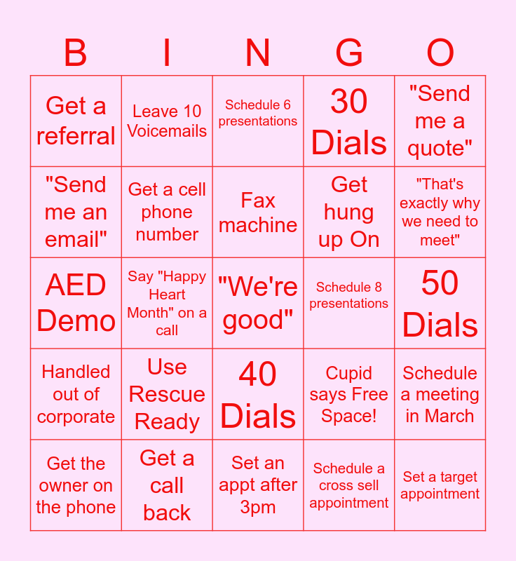 This bingo card has 25 words: Use Rescue Ready, Set an appt after 3pm, Fax machine, Get the owner on the phone, "Send me a quote", Get a referral, "Send me an email", Leave 10 Voicemails, Schedule 8 presentations, 40 Dials, Get hung up On, AED Demo, Cupid says Free Space!, Schedule a meeting in March, Get a cell phone number, Set a target appointment, 50 Dials, Schedule 6 presentations, "That's exactly why we need to meet", Say "Happy Heart Month" on a call, "We're good", Get a call back, Handled out of corporate, 30 Dials and Schedule a cross sell appointment.