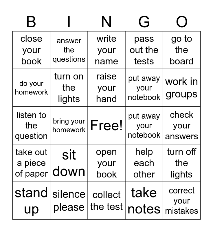 This bingo card has a free space and 24 words: sit down, silence please, raise your hand, stand up, go to the board, close your book, do your homework, answer the questions, put away your notebook, open your book, put away your notebook, listen to the question, help each other, turn off the lights, turn on the lights, take notes, check your answers, write your name, work in groups, bring your homework, correct your mistakes, take out a piece of paper, pass out the tests and collect the test.