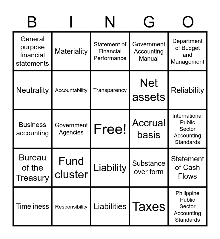 This bingo card has a free space and 41 words: Government accounting, Business accounting, Stewardship, Accountability, Responsibility, Liability, Transparency, Commission on Audit, Department of Budget and Management, Bureau of the Treasury, Government Agencies, Government Accounting Manual, Philippine Public Sector Accounting Standards, International Public Sector Accounting Standards, Accrual basis, Fund cluster, Budget registries, General purpose financial statements, Statement of Financial Position, Statement of Financial Performance, Statement of Cash Flows, Assets, Liabilities, Net assets, Revenue, Expenses, Taxes, Relevance, Reliability, Comparability, Understandability, Materiality, Timeliness, Faithful Representation, Substance over form, Neutrality, Prudence, Completeness, Comparability, Service-oriented and Profit-oriented.