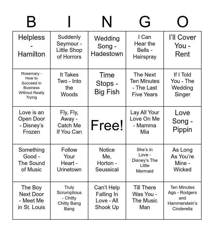 This bingo card has a free space and 31 words: Can’t Help Falling In Love - All Shook Up, Beauty and the Beast - Disney’s Beauty and the Beast, Fly, Fly, Away - Catch Me If You Can, Accident Waiting to Happen - The Drowsy Chaperone, Helpless - Hamilton, Wedding Song - Hadestown, It Takes Two - Into the Woods, She’s in Love - Disney’s The Little Mermaid, Lay All Your Love On Me - Mamma Mia, Till There Was You - The Music Man, Love Song - Pippin, Ten Minutes Ago - Rodgers and Hammerstein’s Cinderella, Right Hand Man - Something Rotten, (I Guess I) Miss You - The SpongeBob Musical, If I Told You - The Wedding Singer, The I Love You Song - The 25th Annual Putnam County Spelling Bee, As Long As You’re Mine - Wicked, Follow Your Heart - Urinetown, Something Good - The Sound of Music, Notice Me, Horton - Seussical, I’ll Cover You - Rent, Something to Believe In - Newsies, The Boy Next Door - Meet Me in St. Louis, Suddenly Seymour - Little Shop of Horrors, The Next Ten Minutes - The Last Five Years, Rosemary - How to Succeed in Business Without Really Trying, I Can Hear the Bells - Hairspray, Love is an Open Door - Disney’s Frozen, Truly Scrumptious - Chitty Chitty Bang Bang, Time Stops - Big Fish and It’s De-Lovely - Anything Goes.