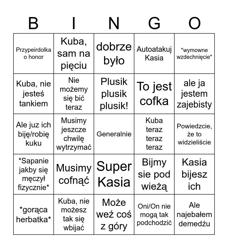 This bingo card has a free space and 24 words: Musimy cofnąć, Kuba, nie możesz tak się wbijać, Plusik plusik plusik!, *gorąca herbatka*, *wymowne wzdechnięcie*, Przypeirdolka o honor, Kuba, nie jesteś tankiem, Kuba, sam na pięciu, Kuba teraz teraz teraz, Super Kasia, To jest cofka, Ale juz ich biję/robię kuku, Bijmy sie pod wieżą, Kasia bijesz ich, Nie możemy się bić teraz, Oni/On nie mogą tak podchodzić, Powiedzcie, że to widzieliście, dobrze było, ale ja jestem zajebisty, Musimy jeszcze chwilę wytrzymać, Ale najebałem demedźu, *Sapanie jakby się męczył fizycznie*, Autoatakuj Kasia and Może weź coś z góry.