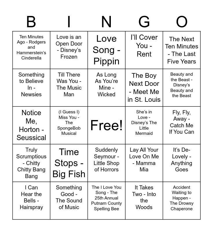 This bingo card has a free space and 31 words: The I Love You Song - The 25th Annual Putnam County Spelling Bee, If I Told You - The Wedding Singer, (I Guess I) Miss You - The SpongeBob Musical, Right Hand Man - Something Rotten, Ten Minutes Ago - Rodgers and Hammerstein’s Cinderella, Love Song - Pippin, Till There Was You - The Music Man, Lay All Your Love On Me - Mamma Mia, She’s in Love - Disney’s The Little Mermaid, It Takes Two - Into the Woods, Fly, Fly, Away - Catch Me If You Can, Accident Waiting to Happen - The Drowsy Chaperone, Wedding Song - Hadestown, Helpless - Hamilton, Beauty and the Beast - Disney’s Beauty and the Beast, Can’t Help Falling In Love - All Shook Up, It’s De-Lovely - Anything Goes, Time Stops - Big Fish, Truly Scrumptious - Chitty Chitty Bang Bang, Suddenly Seymour - Little Shop of Horrors, The Next Ten Minutes - The Last Five Years, Rosemary - How to Succeed in Business Without Really Trying, I Can Hear the Bells - Hairspray, Love is an Open Door - Disney’s Frozen, The Boy Next Door - Meet Me in St. Louis, Something to Believe In - Newsies, I’ll Cover You - Rent, Notice Me, Horton - Seussical, Something Good - The Sound of Music, As Long As You’re Mine - Wicked and Follow Your Heart - Urinetown.