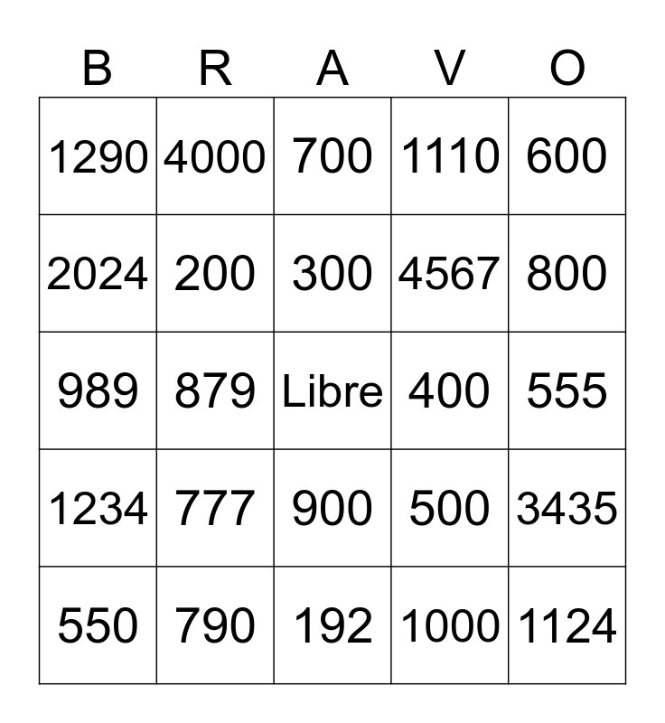 This bingo card has a free space and 34 words: 100, 1000, 1200, 4500, 1234, 200, 600, 550, 4000, 444, 300, 700, 5000, 345, 400, 800, 790, 989, 777, 500, 900, 999, 1290, 555, 192, 1124, 1110, 3890, 4567, 2024, 3457, 879, 3435 and 1,000,000.