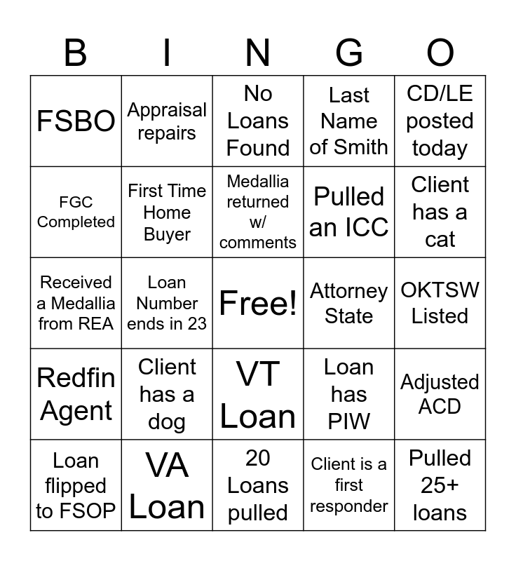 This bingo card has a free space and 24 words: Client has a dog, VA Loan, Medallia returned w/ comments, Loan flipped to FSOP, CD/LE posted today, FSBO, FGC Completed, Appraisal repairs, Attorney State, VT Loan, Pulled an ICC, Received a Medallia from REA, Loan has PIW, Adjusted ACD, First Time Home Buyer, Client is a first responder, OKTSW Listed, No Loans Found, Client has a cat, Loan Number ends in 23, Pulled 25+ loans, Redfin Agent, Last Name of Smith and 20 Loans pulled.