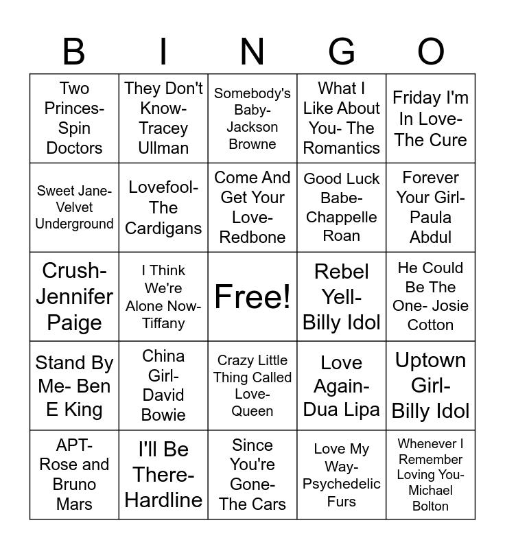This bingo card has a free space and 24 words: China Girl- David Bowie, I'll Be There- Hardline, Come And Get Your Love- Redbone, APT- Rose and Bruno Mars, Friday I'm In Love- The Cure, Two Princes- Spin Doctors, Sweet Jane- Velvet Underground, They Don't Know- Tracey Ullman, Rebel Yell- Billy Idol, Crazy Little Thing Called Love- Queen, Good Luck Babe- Chappelle Roan, Crush- Jennifer Paige, Love Again- Dua Lipa, Uptown Girl- Billy Idol, Lovefool- The Cardigans, Love My Way- Psychedelic Furs, He Could Be The One- Josie Cotton, Somebody's Baby- Jackson Browne, Forever Your Girl- Paula Abdul, I Think We're Alone Now- Tiffany, Whenever I Remember Loving You- Michael Bolton, Stand By Me- Ben E King, What I Like About You- The Romantics and Since You're Gone- The Cars.