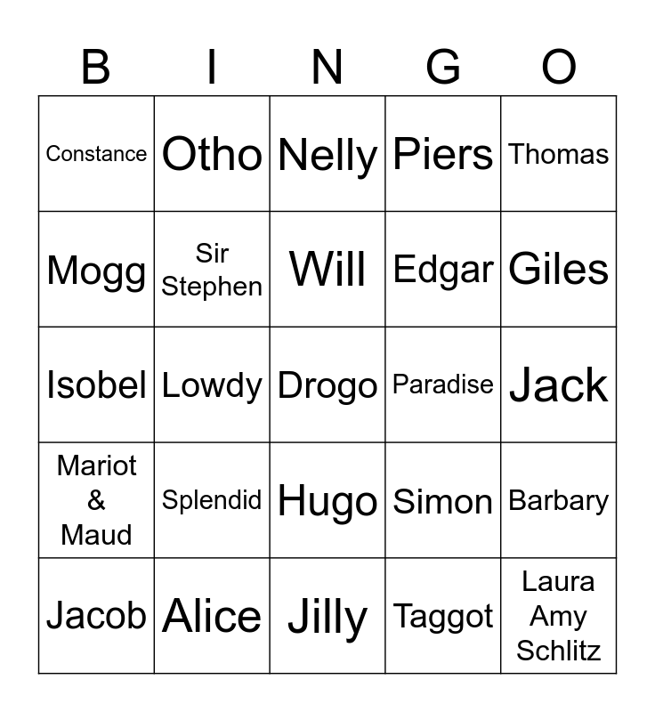 This bingo card has 26 words: Hugo, Taggot, Will, Alice, Thomas, Constance, Mogg, Otho, Jack, Simon, Edgar, Isobel, Barbary, Jacob, Lowdy, Pask, Piers, Mariot & Maud, Nelly, Drogo, Giles, Jilly, Paradise, Splendid, Sir Stephen and Laura Amy Schlitz.