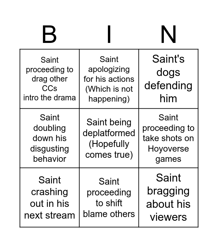 This bingo card has a free space and 8 words: Saint proceeding to take shots on Hoyoverse games, Saint's dogs defending him, Saint apologizing for his actions (Which is not happening), Saint crashing out in his next stream, Saint proceeding to drag other CCs intro the drama, Saint bragging about his viewers, Saint doubling down his disgusting behavior and Saint proceeding to shift blame others.