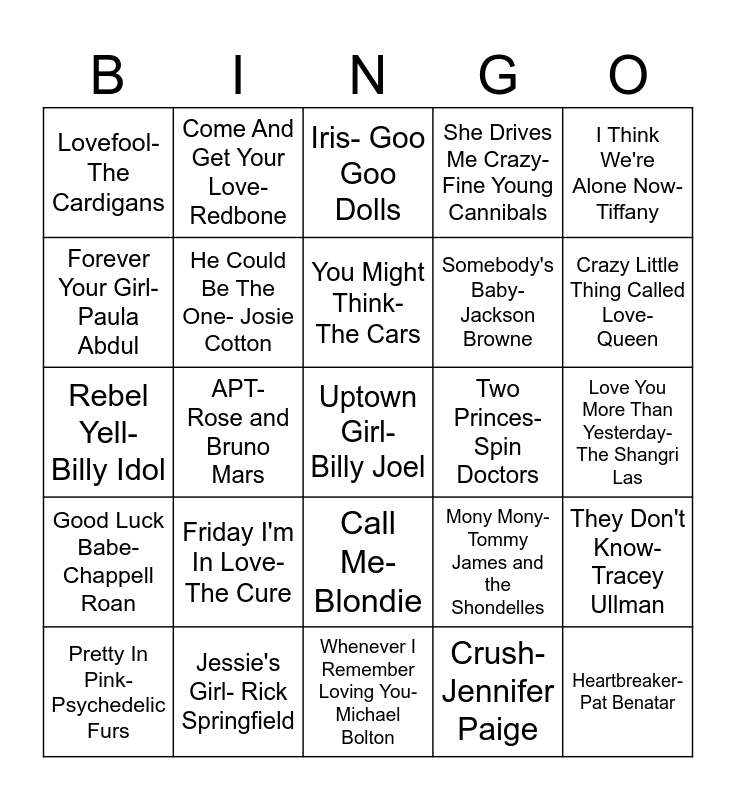 This bingo card has a free space and 24 words: Friday I'm In Love- The Cure, Jessie's Girl- Rick Springfield, You Might Think- The Cars, Pretty In Pink- Psychedelic Furs, I Think We're Alone Now- Tiffany, Lovefool- The Cardigans, Forever Your Girl- Paula Abdul, Come And Get Your Love- Redbone, Two Princes- Spin Doctors, Call Me- Blondie, Somebody's Baby- Jackson Browne, Rebel Yell- Billy Idol, Mony Mony- Tommy James and the Shondelles, They Don't Know- Tracey Ullman, He Could Be The One- Josie Cotton, Crush- Jennifer Paige, Love You More Than Yesterday- The Shangri Las, Iris- Goo Goo Dolls, Crazy Little Thing Called Love- Queen, APT- Rose and Bruno Mars, Heartbreaker- Pat Benatar, Good Luck Babe- Chappell Roan, She Drives Me Crazy- Fine Young Cannibals and Whenever I Remember Loving You- Michael Bolton.