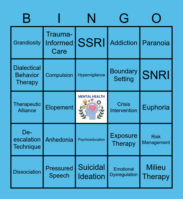 This bingo card has a free space and 24 words: Anhedonia, Pressured Speech, Hypervigilance, Dissociation, Paranoia, Grandiosity, Dialectical Behavior Therapy, Trauma-Informed Care, Crisis Intervention, Psychoeducation, Boundary Setting, Therapeutic Alliance, Exposure Therapy, Risk Management, Compulsion, Emotional Dysregulation, Euphoria, SSRI, SNRI, Elopement, Milieu Therapy, De-escalation Technique, Addiction and Suicidal Ideation.