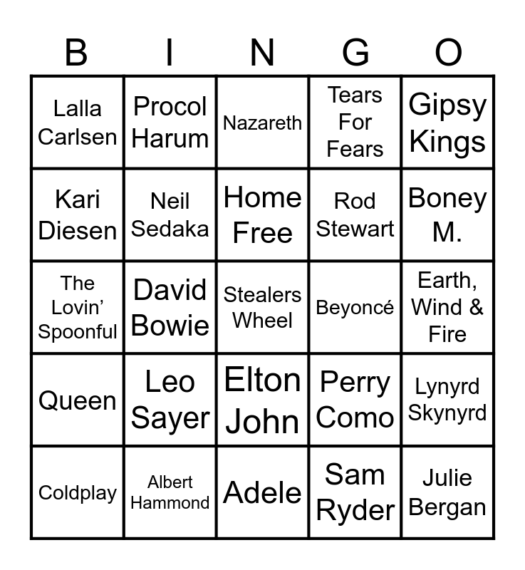 This bingo card has 25 words: Leo Sayer, Adele, Home Free, Coldplay, Gipsy Kings, Lalla Carlsen, Kari Diesen, Procol Harum, Beyoncรฉ, Elton John, Rod Stewart, The Lovinโ Spoonful, Perry Como, Lynyrd Skynyrd, Neil Sedaka, Julie Bergan, Earth, Wind & Fire, Nazareth, Boney M., David Bowie, Stealers Wheel, Albert Hammond, Queen, Tears For Fears and Sam Ryder.