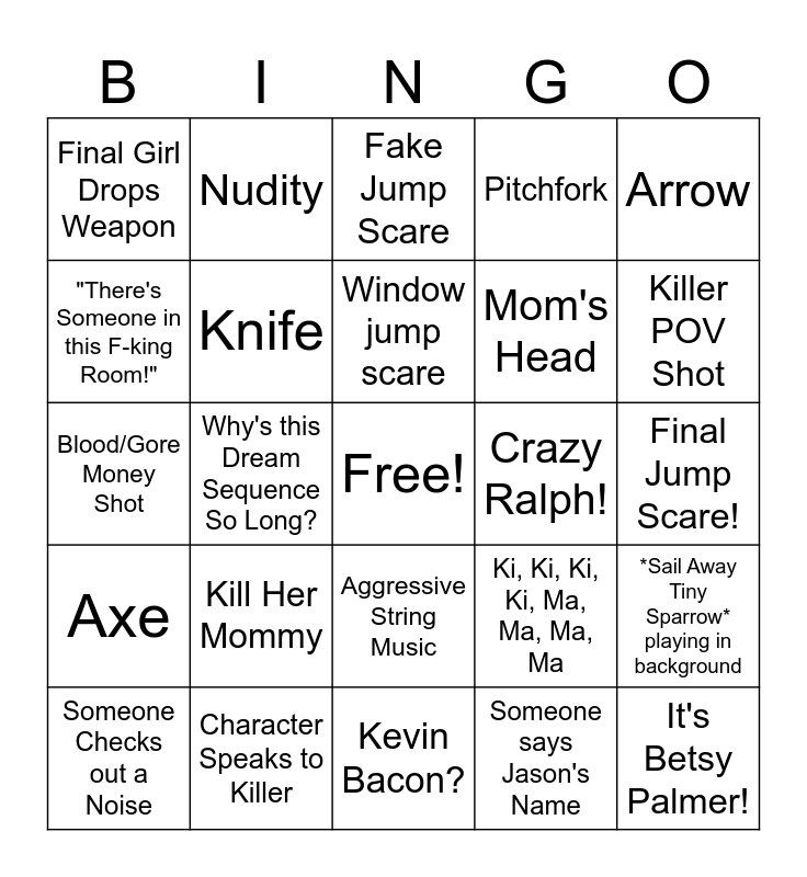 This bingo card has a free space and 34 words: Drinking and/or Drugs, Someone says Jason's Name, Teens Gettin' it On, Machete, Axe, Knife, Arrow, Someone Checks out a Noise, Nudity, Rain Storm, Window jump scare, Fake Jump Scare, Animal Cruelty, Slow-mo final kill, Crazy Ralph!, Killer POV Shot, Character Speaks to Killer, Blood/Gore Money Shot, Kill Her Mommy, Ki, Ki, Ki, Ki, Ma, Ma, Ma, Ma, Aggressive String Music, Teen Shenanigans, Final Girl Drops Weapon, Final Jump Scare!, Kevin Bacon?, It's Betsy Palmer!, Pitchfork, Chainsaw, Mom's Head, "There's Someone in this F-king Room!", Sandy, the Lonely Waitress, Why's this Dream Sequence So Long?, *Sail Away Tiny Sparrow* playing in background and Hallucinating Mom.
