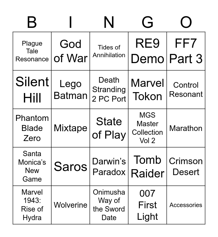 This bingo card has a free space and 24 words: Saros, Wolverine, Death Stranding 2 PC Port, Marvel 1943: Rise of Hydra, FF7 Part 3, Plague Tale Resonance, Silent Hill, God of War, MGS Master Collection Vol 2, Darwin’s Paradox, Marvel Tokon, Phantom Blade Zero, Tomb Raider, Crimson Desert, Lego Batman, 007 First Light, Marathon, Tides of Annihilation, Control Resonant, Mixtape, Accessories, Santa Monica’s New Game, RE9 Demo and Onimusha Way of the Sword Date.