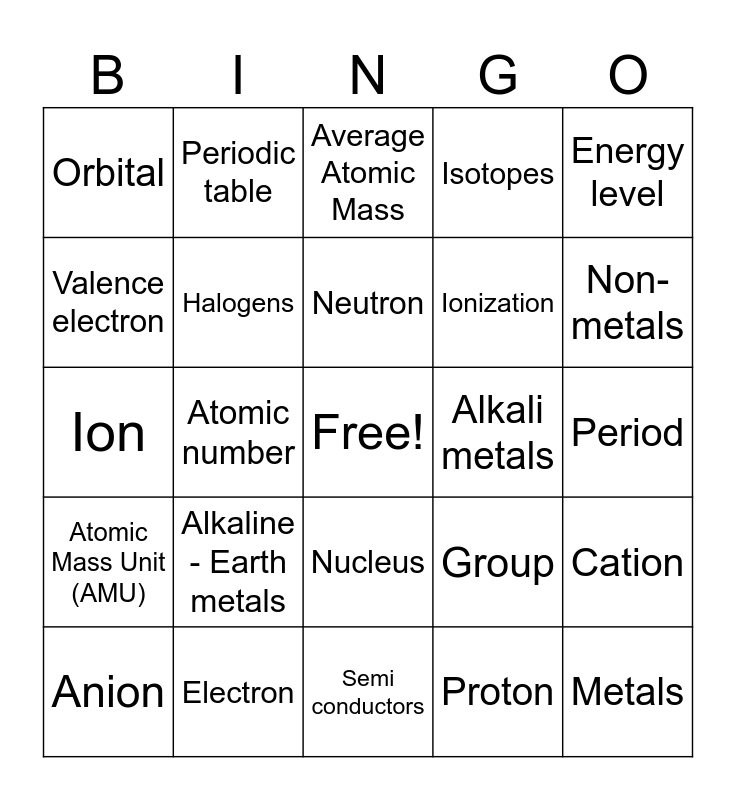 This bingo card has a free space and 26 words: Nucleus, Proton, Neutron, Electron, Energy level, Orbital, Valence electron, Periodic table, Period, Group, Ionization, Ion, Cation, Anion, Atomic number, Mass number, Isotopes, Atomic Mass Unit (AMU), Average Atomic Mass, Metals, Non-metals, Semi conductors, Alkali metals, Alkaline - Earth metals, Halogens and Noble gases.