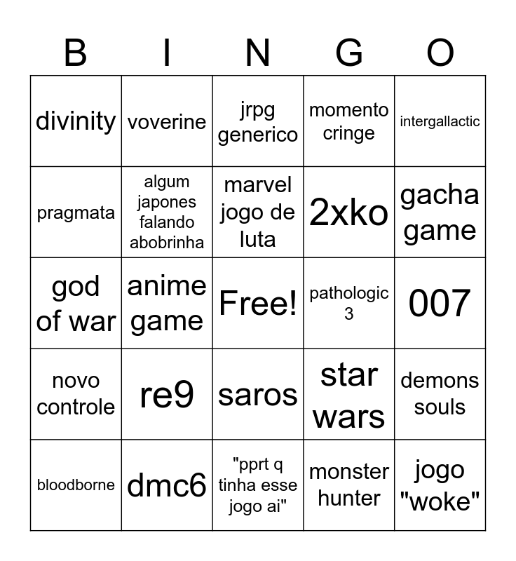 This bingo card has a free space and 24 words: re9, dmc6, marvel jogo de luta, bloodborne, intergallactic, divinity, pragmata, voverine, pathologic 3, saros, 2xko, god of war, star wars, demons souls, algum japones falando abobrinha, monster hunter, 007, jrpg generico, gacha game, anime game, jogo "woke", novo controle, momento cringe and "pprt q tinha esse jogo ai".