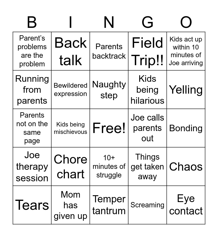 This bingo card has a free space and 34 words: Dad lives at work, Screaming, Hitting, Swearing, Joe therapy session, Bewildered expression, Kids act up within 10 minutes of Joe arriving, Tears, Back talk, Dad doesn’t know what to do, Naughty step, Parents backtrack, Children/child rule the house, Kids don’t listen to mom, Joe calls parents out, Yelling, Mom has given up, Parents not on the same page, Chore chart, Things get taken away, 10+ minutes of struggle, Joe steps in during chaos, Parent’s problems are the problem, Bonding, Temper tantrum, Eye contact, Field Trip!!, Joe Joe, Kids being hilarious, Running from parents, Kids are finally calm, Kids being mischievous, Chaos and Parents don’t give kids attention.