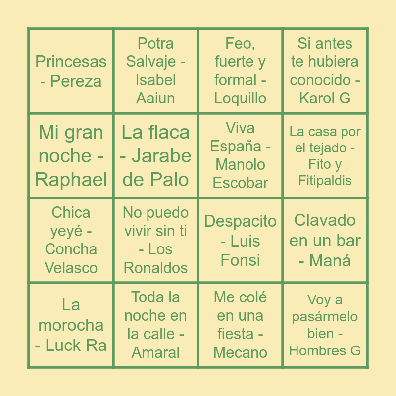 This bingo card has 38 words: Venecia - Hombres G, Himno Atlético de Madrid, Himno Real Madrid, Viva España - Manolo Escobar, Sirenas - Taburete, Puedes contar conmigo - La Oreja de Van Gogh, La casa por el tejado - Fito y Fitipaldis, Caminando por la vida - Melendi, Mi gran noche - Raphael, Chica yeyé - Concha Velasco, Clavado en un bar - Maná, Si antes te hubiera conocido - Karol G, La morocha - Luck Ra, Me colé en una fiesta - Mecano, La flaca - Jarabe de Palo, Voy a pasármelo bien - Hombres G, Un beso y una flor - Nino Bravo, Feo, fuerte y formal - Loquillo, Salta - Tequila, Toda la noche en la calle - Amaral, Princesas - Pereza, Zapatillas - El Canto del Loco, No puedo vivir sin ti - Los Ronaldos, Volaré - Gipsy Kings, Ave María - David Bisbal, Nada fue un error - Coti, Cuando zarpa el amor - Camela, Por la raja de tu falda - Estopa, Todos los días sale el sol - Bongo Botrako, El sol no regresa - La Quinta Estación, La tortura - Shakira y Alejandro Sanz, Suavemente - Elvis Crespo, Vivir mi vida - Marc Anthony, Potra Salvaje - Isabel Aaiun, Torero - Chayanne, Cómo te atreves - Morat, Despacito - Luis Fonsi and Despechá - Rosalía.