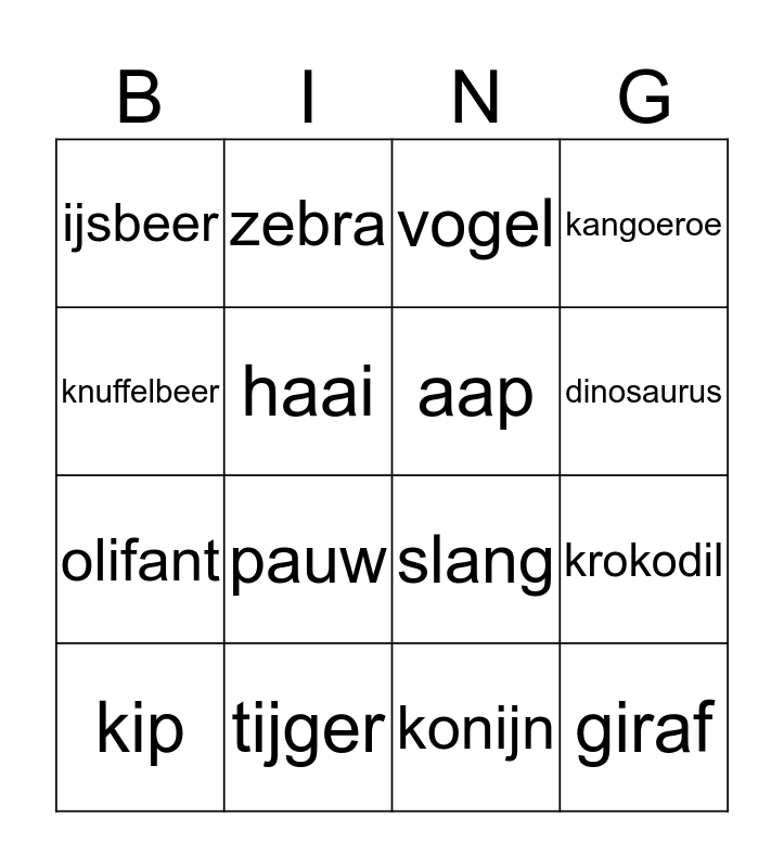 This bingo card has 16 words: tijger, krokodil, vogel, ijsbeer, olifant, zebra, slang, konijn, knuffelbeer, haai, kip, kangoeroe, pauw, dinosaurus, aap and giraf.