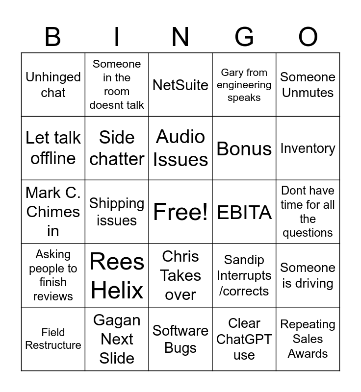 This bingo card has a free space and 24 words: Rees Helix, Gagan Next Slide, Audio Issues, Field Restructure, Someone Unmutes, Unhinged chat, Let talk offline, Someone in the room doesnt talk, EBITA, Chris Takes over, Bonus, Mark C. Chimes in, Sandip Interrupts /corrects, Someone is driving, Side chatter, Clear ChatGPT use, Dont have time for all the questions, NetSuite, Inventory, Shipping issues, Repeating Sales Awards, Asking people to finish reviews, Gary from engineering speaks and Software Bugs.