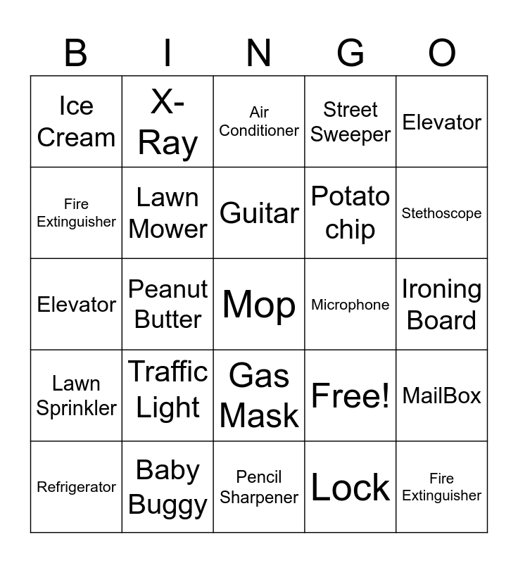 This bingo card has 25 words: Traffic Light, Pencil Sharpener, Guitar, Refrigerator, Elevator, Ice Cream, Fire Extinguisher, X-Ray, Microphone, Gas Mask, Potato chip, Elevator, Free!, MailBox, Lawn Mower, Fire Extinguisher, Ironing Board, Air Conditioner, Stethoscope, Peanut Butter, Mop, Baby Buggy, Lawn Sprinkler, Street Sweeper and Lock.