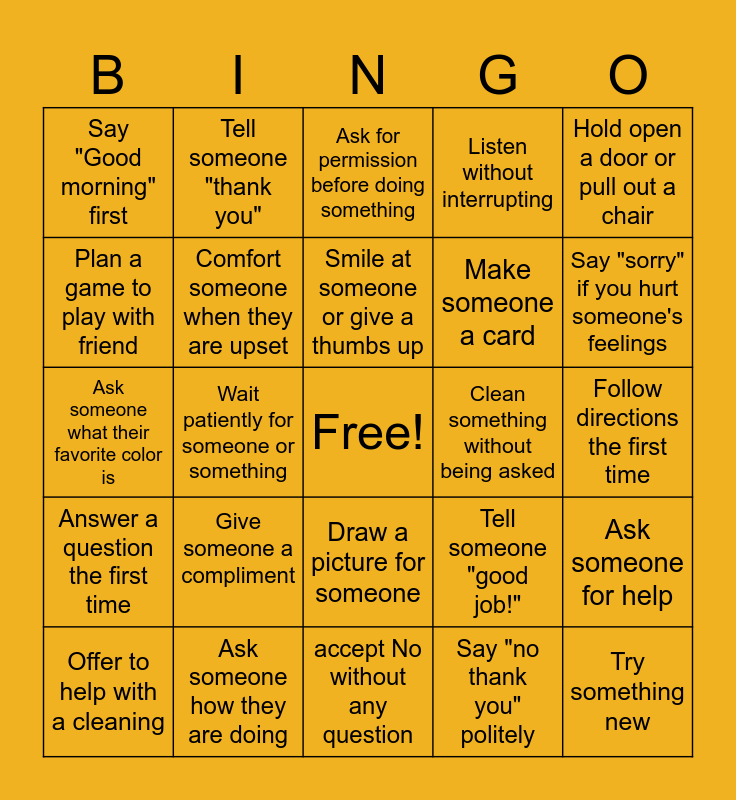 This bingo card has a free space and 24 words: Give someone a compliment, Ask someone how they are doing, Smile at someone or give a thumbs up, Offer to help with a cleaning, Hold open a door or pull out a chair, Say "Good morning" first, Plan a game to play with friend, Tell someone "thank you", Clean something without being asked, Draw a picture for someone, Make someone a card, Ask someone what their favorite color is, Tell someone "good job!", Ask someone for help, Comfort someone when they are upset, Say "no thank you" politely, Follow directions the first time, Ask for permission before doing something, Say "sorry" if you hurt someone's feelings, Wait patiently for someone or something, Try something new, Answer a question the first time, Listen without interrupting and accept No without any question.