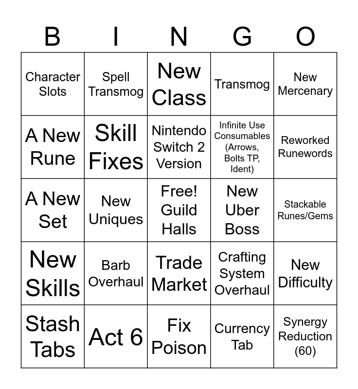 This bingo card has a free space and 29 words: Stash Tabs, New Rune Words, New Uniques, New Game Mode, Character Slots, New Class, Skill Fixes, Barb Overhaul, New Uber Boss, Act 6, Stackable Runes/Gems, Synergy Reduction (60), Fix Poison, Currency Tab, Reworked Runewords, Act 4 Completed, Trade Market, New Skills, New Mercenary, A New Set, Crafting System Overhaul, Cosmetics, Infinite Use Consumables (Arrows, Bolts TP, Ident), A New Rune, Transmog, Spell Transmog, New Difficulty, Nintendo Switch 2 Version and Crossplay.