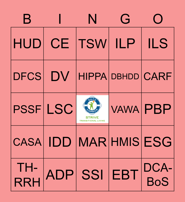 This bingo card has a free space and 46 words: ACES, ADP, BMSE, CANS, CARF, CASA, CE, CM, DBHDD, DCA- BoS, DFCS, DV, EBT, ESG, FYSB, GAL, HIPPA, HMIS, HQS, HUD, IDD, IEP, ILP, ILS, ISP, LSC, MAR, NYTD, PBP, PSSF, RHY, RRH, SNAP, SOAR, SOP, SSDI, SSI, STRIVE, TH, TH-RRH, TLP, TSW, VAWA, VI-SPDAT-TAY, WTLP and YHDP.