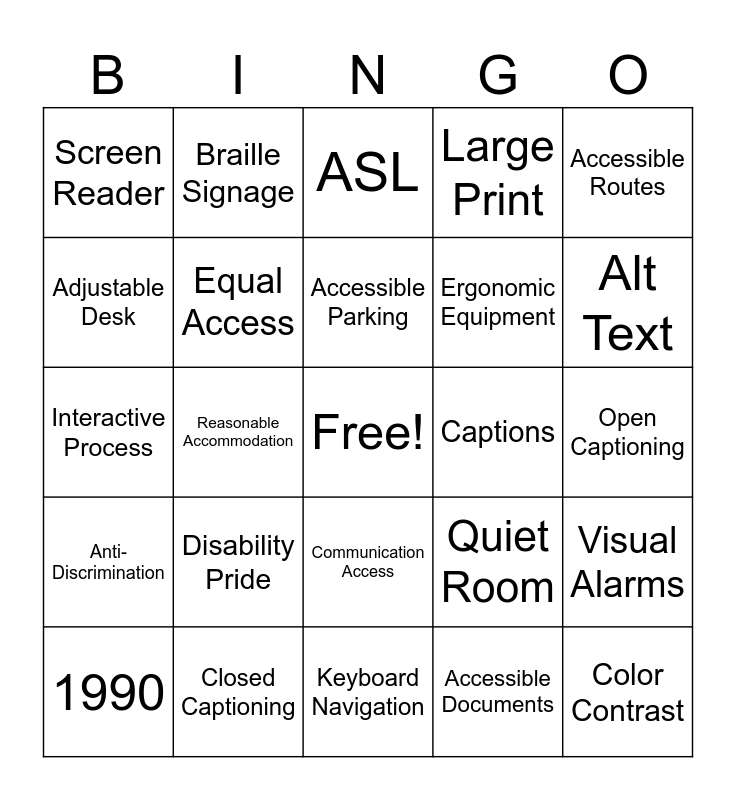 This bingo card has a free space and 29 words: 1990, Barrier Free, Reasonable Accommodation, Digital Accessibility, Screen Reader, ASL, Equal Access, Disability Pride, Captions, Closed Captioning, Open Captioning, Color Contrast, Keyboard Navigation, Accessible Documents, Alt Text, Service Animals, Communication Access, Anti-Discrimination, Accessible Routes, Interactive Process, Quiet Room, In Office Accommodations, Ergonomic Equipment, Adjustable Desk, Large Print, Braille Signage, Visual Alarms, Accessible Parking and Mobility Access.