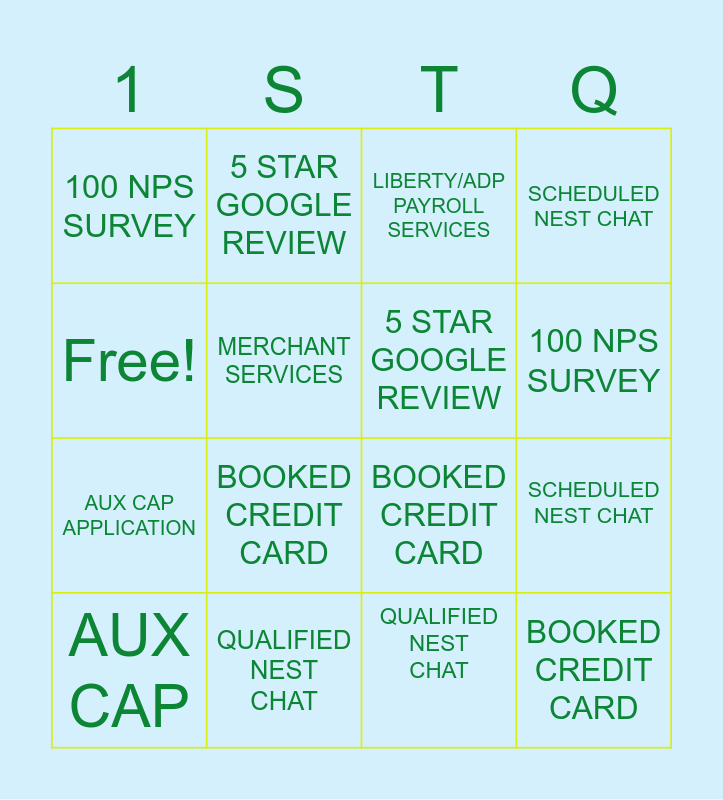 This bingo card has 16 words: QUALIFIED NEST CHAT, SCHEDULED NEST CHAT, LIBERTY/ADP PAYROLL SERVICES, 100 NPS SURVEY, AUX CAP APPLICATION, 5 STAR GOOGLE REVIEW, BOOKED CREDIT CARD, QUALIFIED NEST CHAT, Free!, MERCHANT SERVICES, AUX CAP, SCHEDULED NEST CHAT, BOOKED CREDIT CARD, 100 NPS SURVEY, 5 STAR GOOGLE REVIEW and BOOKED CREDIT CARD.