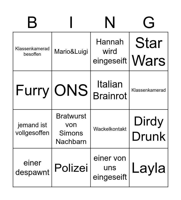 This bingo card has 16 words: Polizei, Dirdy Drunk, Hannah wird eingeseift, Klassenkamerad besoffen, jemand ist vollgesoffen, Mario&Luigi, Wackelkontakt, einer von uns eingeseift, Furry, ONS, einer despawnt, Star Wars, Bratwurst von Simons Nachbarn, Klassenkamerad, Italian Brainrot and Layla.