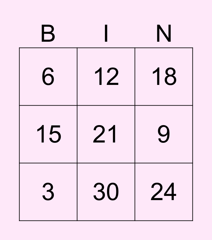This bingo card has a free space and 9 words: 3, 18, 12, 15, 6, 9, 24, 27 and 30.