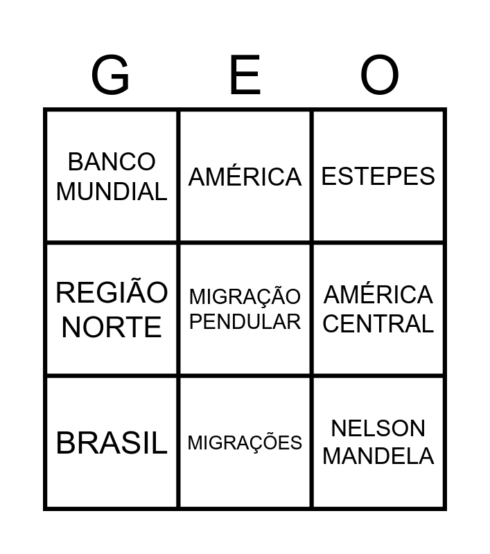This bingo card has 49 words: TERRITÓRIO, NAÇÃO, ESTADO, GOVERNO, NAÇÕES SEM ESTADO, ÁFRICA, AMÉRICA, AMÉRICA DO NORTE, AMÉRICA CENTRAL, AMÉRICA DO SUL, BRASIL, REGIÃO NORTE, REGIÃO NORDESTE, REGIÃO SUDESTE, REGIÃO SUL, REGIÃO CENTRO-OESTE, MIGRAÇÕES, EMIGRANTE, IMIGRANTE, MIGRAÇÃO PENDULAR, ONU, OBJETIVOS DE DESENVOLVIMENTO SUSTENTÁVEL, BANCO MUNDIAL, NELSON MANDELA, APARTHEID, MERCOSUL, BRICS, BLOCOS ECONÔMICOS, CAPITALISMO, SOCIALISMO, PAÍSES DESENVOLVIDOS, PAÍSES EM DESENVOLVIMENTO, CURDOS, RELEVO, CLIMA, VEGETAÇÃO, HIDROGRAFIA, MONTANHAS, PLANÍCIES, DEPRESSÕES, FLORESTA TROPICAL, DESERTO, SAVANA, DESERTO DO SAARA, TUNDRA, ESTEPES, CLIMA TROPICAL, CLIMA SEMIÁRIDO and CLIMA POLAR.