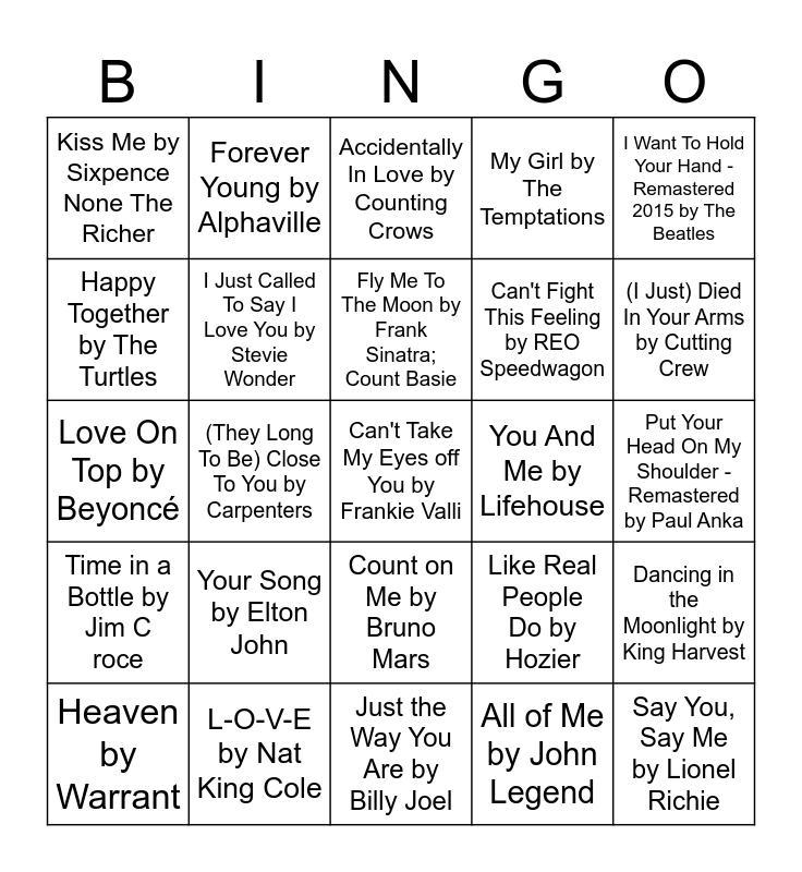 This bingo card has 47 words: Heaven by Bryan Adams, Can't Take My Eyes off You by Frankie Valli, I'm a Believer Remaster by The Monkees, Just the Way You Are by Billy Joel, Your Song by Elton John, Don't Go Breaking My Heart by Elton John; Kiki Dee, Forever Young by Alphaville, How Deep Is Your Love by Bee Gees, Happy Together by The Turtles, Faithfully (2023 Remaster) by Journey, I Just Called To Say I Love You by Stevie Wonder, My Girl by The Temptations, Dancing in the Moonlight by King Harvest, Like Real People Do by Hozier, Just the Two of Us by Grover Washington, Jr.; Bill Withers, Time After Time by Cyndi Lauper, Fly Me To The Moon by Frank Sinatra; Count Basie, You And Me by Lifehouse, (I've Had) The Time of My Life by Bill Medley; Jennifer Warnes, I Want To Hold Your Hand - Remastered 2015 by The Beatles, (They Long To Be) Close To You by Carpenters, All of Me by John Legend, Kiss Me by Sixpence None The Richer, Can't Fight This Feeling by REO Speedwagon, I Don't Want to Miss a Thing Soundtrack by Aerosmith, (I Just) Died In Your Arms by Cutting Crew, Heaven by Warrant, End Of The Road by Boyz II Men, Count on Me by Bruno Mars, Time in a Bottle by Jim Croce, How Sweet It Is (To Be Loved By You) by James Taylor, Marry Me by Train, a thousand years by Christina Perri, I Love You So by The Walters, Can't Help Falling in Love by Elvis Presley, L-O-V-E by Nat King Cole, Put Your Head On My Shoulder - Remastered by Paul Anka, Somethin' Stupid by Frank Sinatra; Nancy Sinatra, Dream A Little Dream Of Me by The Mamas & The Papas, She's Always a Woman by Billy Joel, Say You, Say Me by Lionel Richie, Accidentally In Love by Counting Crows, Love On Top by Beyoncé, Welcome Me Love by Brooklyn Bridge, You Make My Dreams (Come True) by Daryl Hall & John Oates, Stand By Me by Ben E. King and September by Earth, Wind & Fire.