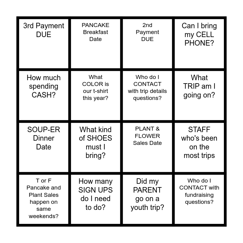 This bingo card has 16 words: How many SIGN UPS do I need to do?, STAFF who's been on the most trips, 2nd Payment DUE, 3rd Payment DUE, SOUP-ER Dinner Date, PANCAKE Breakfast Date, PLANT & FLOWER Sales Date, Did my PARENT go on a youth trip?, How much spending CASH?, What COLOR is our t-shirt this year?, T or F Pancake and Plant Sales happen on same weekends?, Can I bring my CELL PHONE?, What kind of SHOES must I bring?, What TRIP am I going on?, Who do I CONTACT with trip details questions? and Who do I CONTACT with fundraising questions?.