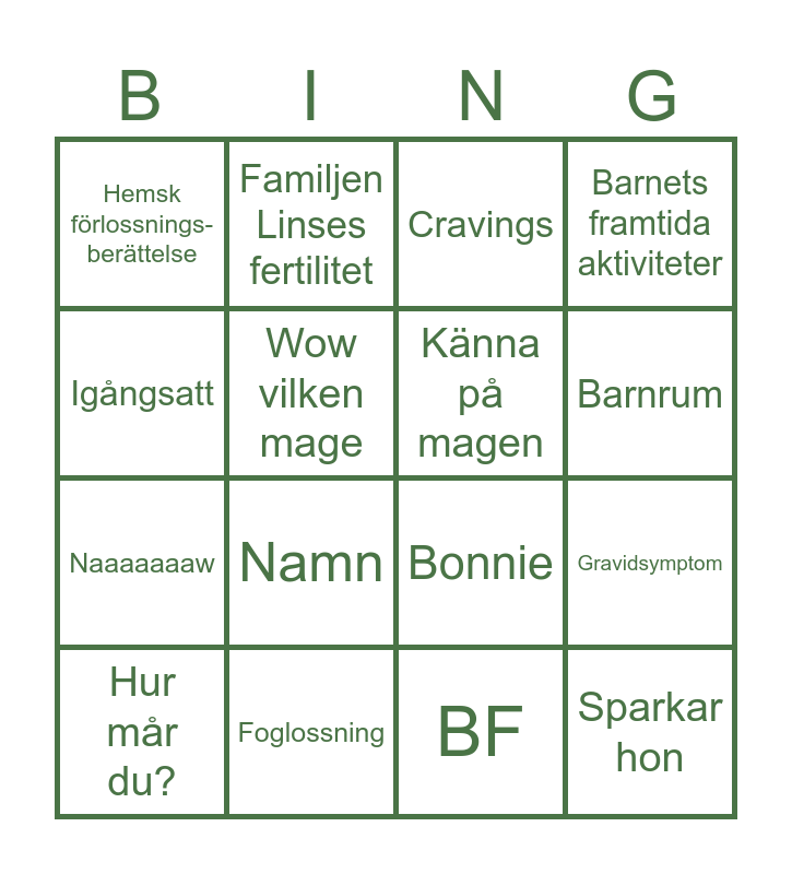 This bingo card has 16 words: Foglossning, Gravidsymptom, Cravings, Hemsk förlossnings-berättelse, Naaaaaaaw, Familjen Linses fertilitet, Bonnie, BF, Igångsatt, Wow vilken mage, Hur mår du?, Barnets framtida aktiviteter, Namn, Barnrum, Känna på magen and Sparkar hon.