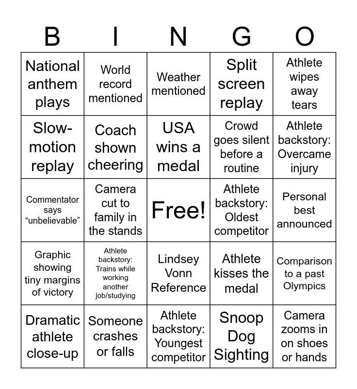 This bingo card has a free space and 26 words: Lindsey Vonn Reference, Snoop Dog Sighting, USA wins a medal, Someone crashes or falls, Athlete wipes away tears, National anthem plays, Slow-motion replay, World record mentioned, Personal best announced, Athlete kisses the medal, Crowd goes silent before a routine, Commentator says “unbelievable”, Comparison to a past Olympics, Dramatic athlete close-up, Camera cut to family in the stands, Flag waving shot, Split screen replay, Graphic showing tiny margins of victory, Weather mentioned, Camera zooms in on shoes or hands, Athlete backstory: Overcame injury, Athlete backstory: Youngest competitor, Athlete backstory: Oldest competitor, Athlete backstory: Trains while working another job/studying, Coach shown cheering and Emotional interview.