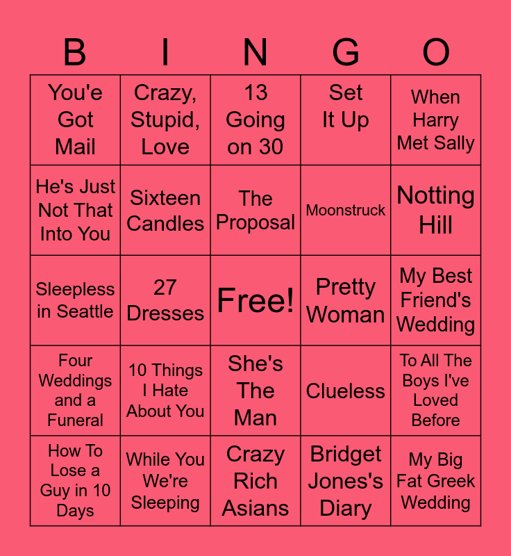 This bingo card has a free space and 24 words: 10 Things I Hate About You, While You We're Sleeping, The Proposal, How To Lose a Guy in 10 Days, When Harry Met Sally, You'e Got Mail, He's Just Not That Into You, Crazy, Stupid, Love, Pretty Woman, She's The Man, Moonstruck, Sleepless in Seattle, Clueless, To All The Boys I've Loved Before, Sixteen Candles, Bridget Jones's Diary, My Best Friend's Wedding, 13 Going on 30, Notting Hill, 27 Dresses, My Big Fat Greek Wedding, Four Weddings and a Funeral, Set It Up and Crazy Rich Asians.