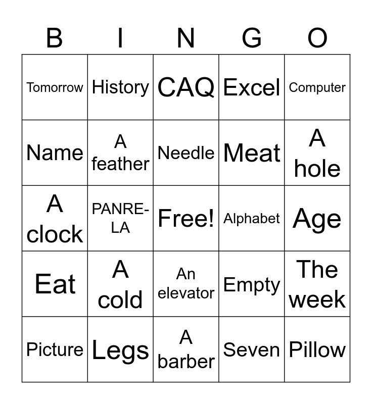 This bingo card has a free space and 24 words: A cold, Legs, Needle, Picture, Computer, Tomorrow, Name, History, Alphabet, An elevator, Meat, A clock, Empty, The week, A feather, Seven, Age, CAQ, A hole, PANRE-LA, Pillow, Eat, Excel and A barber.