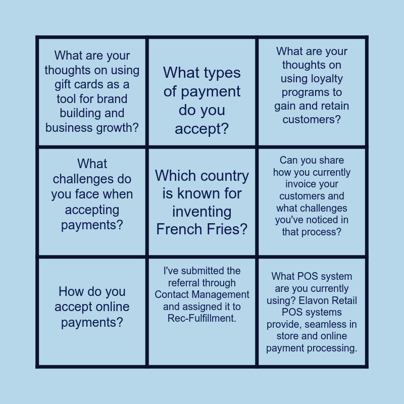 This bingo card has a free space and 8 words: Can you share how you currently invoice your customers and what challenges you've noticed in that process?, What are your thoughts on using loyalty programs to gain and retain customers?, What types of payment do you accept?, How do you accept online payments?, What are your thoughts on using gift cards as a tool for brand building and business growth?, What POS system are you currently using? Elavon Retail POS systems provide, seamless in store and online payment processing., What challenges do you face when accepting payments? and I've submitted the referral through Contact Management and assigned it to Rec-Fulfillment..